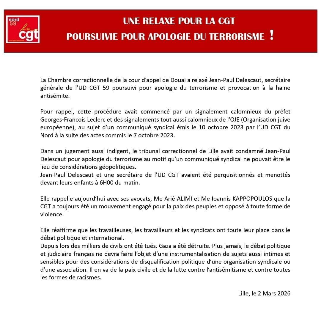 La CGT à fait et continue de faire face à des attaques répétées de la part du gouvernement via ses représentants en préfectures et certains organismes religieux. Il semblerait que les organisations syndicales n’aient pas droit à leurs yeux, à la parole sur la situation génocidaire en Palestine. Il ne fait pas bon dire que le gouvernement Israëlien orchestre un génocide en Palestine. Certaines personnes bien attentionnées pensent que cela équivaut à des paroles antisémites. Le Préfet du nord et l’OJE (Organisation Juive Européenne) ont porté plainte contre le représentant de l’UD 59 suite à un communiqué du 10 octobre 2025 dénonçant l’attaque du 07 octobre.