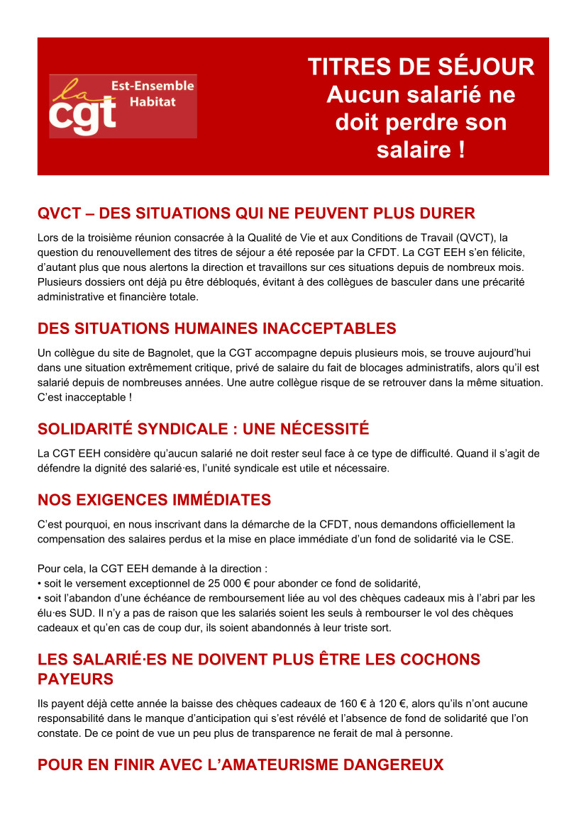 C’est le cas pour un salarié de Est-Ensemble Habitat. La CGT en lien avec la CFDT met tout en œuvre pour que leur collègue ne soit pas inquiété et demande aux Elus et à la Direction de EEH d’intervenir et d’agir.