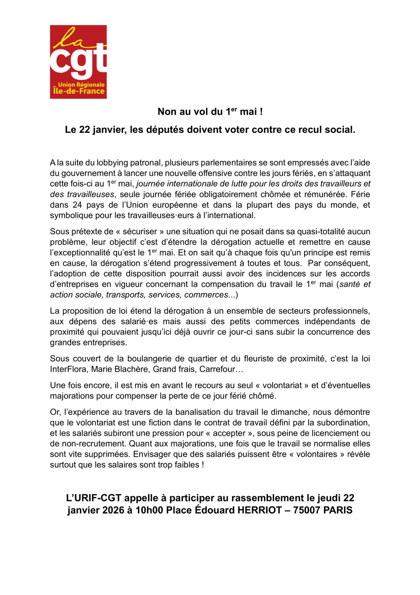 le 1er mai est l’unique jour férié obligatoire chômé et rémunéré, cela dans 24 pays en Europe et bien plus dans le monde. Ce jour si particulier, l’est également dans le pays le plus libéral que sont les Etats-Unis, et ce sans être remis en cause. C’est pourtant la demande du patronat français au prétexte que les boulangeries sont ouvertes le 1er Mai - au seul choix des patrons de boulangerie-s de quartier et fleuristes de proximités) les salariés devraient pouvoir travailler ce jour, comme un jour ordinaire.