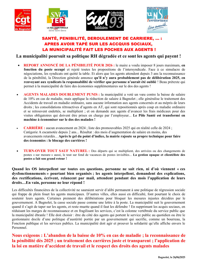 En effet, le Maire et sa majorité continuent de mener tambours battants une politique sociale dévastatrice, après avoir voté à l’unanimité en conseil municipal une motion de soutien aux agents de territoriaux pour le maintien du salaire en cas de maladie , rien n’est suivit dans les faits. Bien au contraire, santé, pénibilité, déroulement de carrière,... Après avoir tapé sur les acquis sociaux, la municipalité fait les poches des agents ! La ville continue sa politique RH dégradée et ce sont les agents qui paient